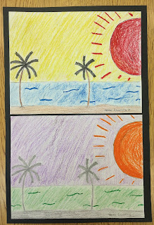 Claude Monet painted the same thing over and over again, but during different times of day during different seasons. Due to this (see below, Haystack series example) although his subject remained the same, his color palette changed dramatically from painting to painting. Students explored how the use of color can effect a person's mood and feeling by drawing one landscapes, making a copy of it, then used two opposite sets of colors to color each in. We then hung the pictures around the room and discussed how color affects your artwork and how people look at it.